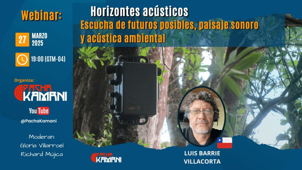 Desde el Colectivo PachaKamani, seguimos explorando los territorios del sonido y sus significados. En esta ocasión, te invitamos a participar de nuestro 2do webinar de este ciclo, titulado «Horizontes acústicos: La escucha de los futuros posibles en el campo del paisaje sonoro y la acústica ambiental», donde abordaremos el impacto de las transformaciones acústicas en los territorios y cómo estas pueden ser negociadas y comprendidas desde perspectivas comunitarias.