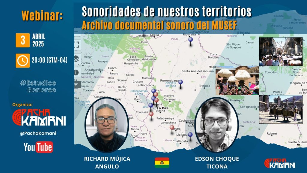 Desde el Colectivo PachaKamani, continuamos con la serie de charlas virtuales del ciclo Estudios Sonoros, y te invitamos a participar del 5to webinar titulado «Sonoridades de nuestros territorios. Archivo documental sonoro del MUSEF», en el que se presentará un acercamiento reflexivo y crítico al extenso fondo sonoro del Museo Nacional de Etnografía y Folklore (MUSEF), […]